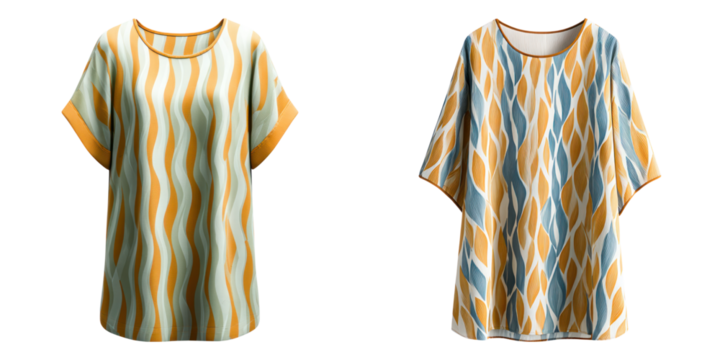 Boxy tunic top with broken wave pattern in soft orange and blue tones, casual and comfortable for everyday wear