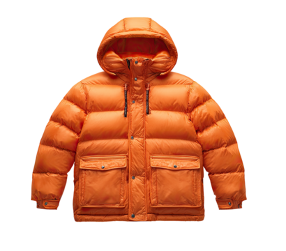 Bright orange puffer jacket with hood.  Full-length zippered front closure.  Large, boxy fit.  Multiple pockets