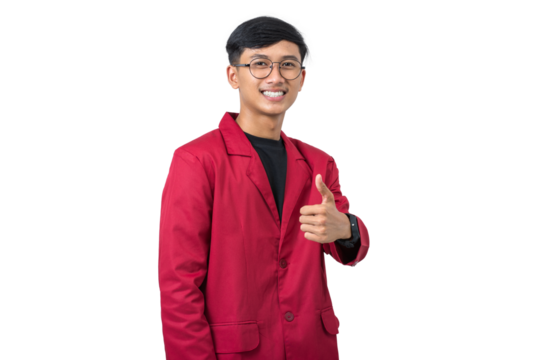 Smiling college student giving thumbs up like gesture isolated on white background