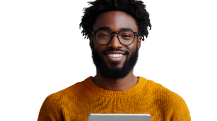 Happy man holding tablet with copy space on transparent background