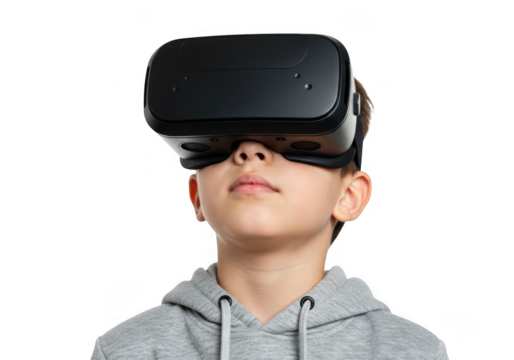 Young boy wearing a virtual reality headset isolated on transparent background