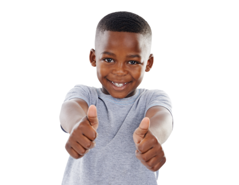 Portrait, smile and boy with thumbs up, child or agreement isolated on transparent background. Face, person or kid with happiness, hand gesture or emoji with feedback, png or symbol with like or icon
