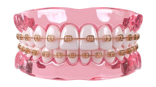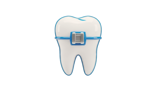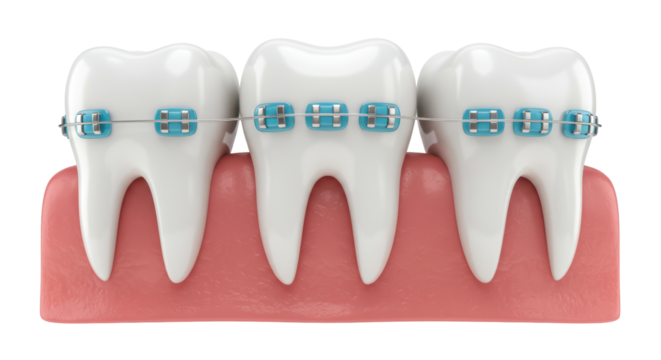 Close-up of three white teeth with metal braces attached in a low resolution transparent image