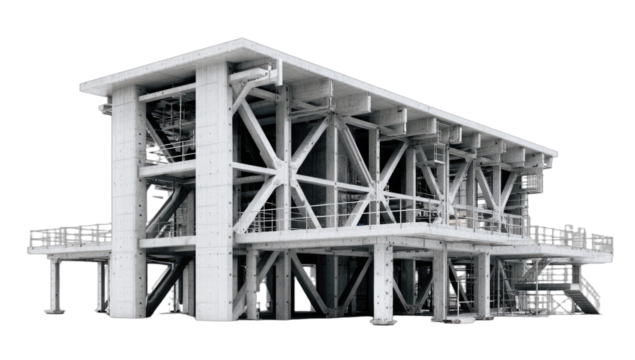 Stark, geometric, multi-level concrete and steel structure on stilts