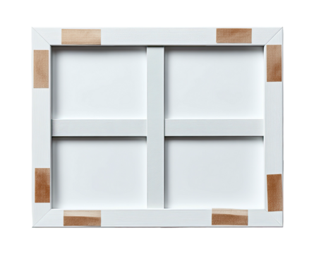 Rear view of a rectangular stretched canvas, framed with a white wooden structure, and bracing