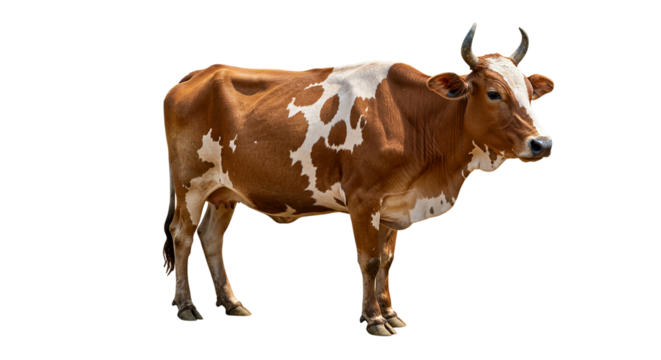 Isolated brown and white cow standing in a field for dairy farming and agriculture stock photo image