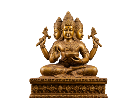 Golden statue of hindu lord ganesha and lord brahma sitting on lotus base with traditional ornaments isolated on black background representing spirituality devotion wisdom prosperity blessing