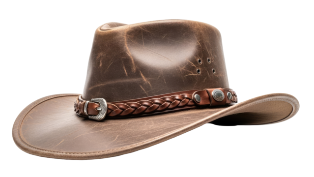 Aged leather cowboy hat with braided band isolated on a transparent background