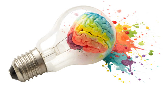 Conceptual illustration of a human brain inside a light bulb symbolizing a brilliant idea or innovation isolated on transparent background