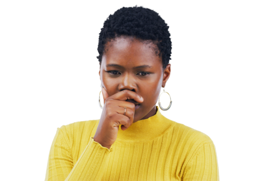 African woman, doubt and portrait of thinking of a question, why or confused ideas on transparent, isolated or png background. Serious, face and planning a decision, choice or person brainstorming