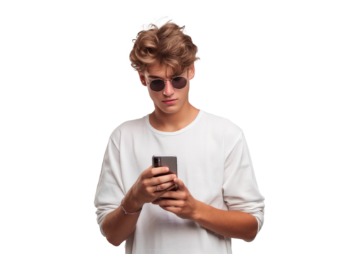 Hombre joven usando un smartphone, fondo blanco