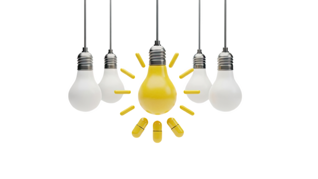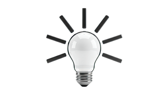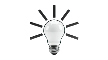 Bright white lightbulb illuminated with yellow rays against stark black backdrop