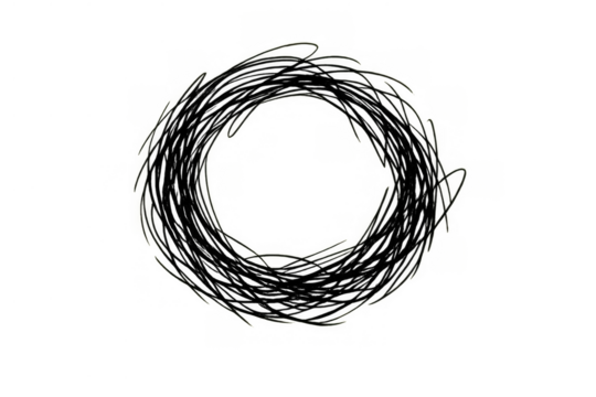 Scribble drawing creating a tangled black circle, illustrating confusion, chaos, and abstract disorder concept with transparent background