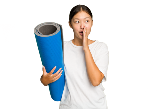 Young asian woman holding a mat isolated on green chroma background is saying a secret hot braking news and looking aside