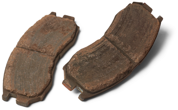 pair of old worn out car disc brake pads, components of vehicle braking system, made of friction materials that grip brake disc or rotor isolated on white background, vehicle maintenance and repair