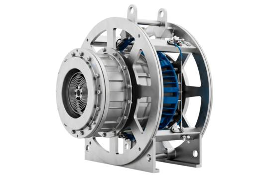 Industrial electric motor and braking system for heavy machinery isolated on a transparent background