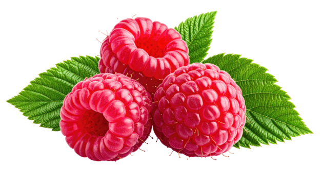 Three vibrant, ripe raspberries with textured surfaces sit amid lush, green leaves on a transparent background, perfect for food imagery