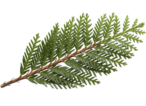 Green coniferous evergreen tree branch on a transparent background, isolated PNG file