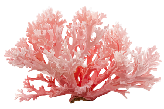 A detailed close-up of a pink coral formation with intricate fronds, set against a black background
