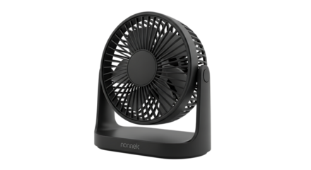 Black Desk Fan with Adjustable Head and Brand Name isolated on a transparent background