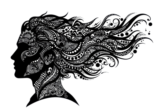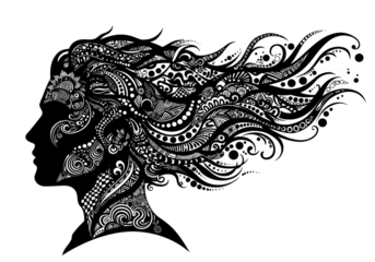 Black silhouette of a man's head and torso in profile, with abstract flowing hair featuring geometric patterns and dots on a white background with copy space. Concept of graphic elegance