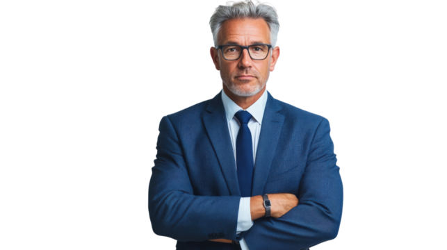 Confident businesswoman in a professional suit poses with crossed arms, exuding a sense of authority and competence. Ideal for depicting leadership and success in the workplace.