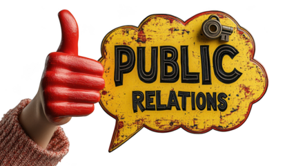 Red thumbs up gesture next to a rusty yellow public relations sign isolated on transparent background