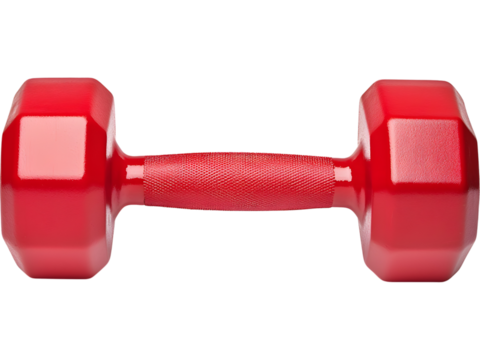 Glossy red dumbbell isolated on transparent background. Ideal for energetic fitness visuals and modern gym branding.