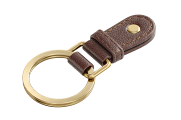 Brown leather keychain mockup with polished gold ring isolated on transparent background, versatile high‑resolution PNG cutout perfect for showcasing logos, branding presentations, and professional