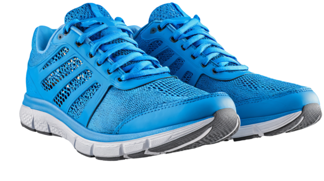 Vibrant blue running shoes resting on a pristine transparent background high resolution PNG style athletic footwear cutout ideal for fitness branding ecommerce product design