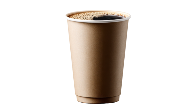 Tall kraft paper disposable coffee cup filled with dark hot beverage and foamy crema, perfect for cafe promotions and beverage branding concepts.