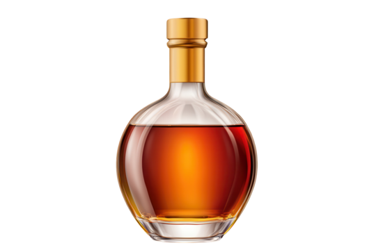 Rich and amber-colored brandy encapsulated in a graceful round bottle with a golden cap against a simple backdrop, perfect for elegant occasions and tasting events