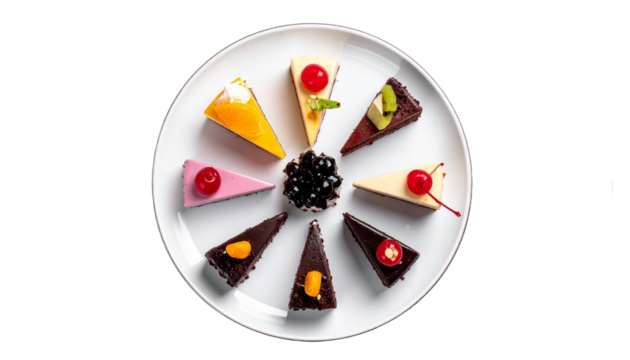 Fruit and Pudding Dessert on Plate, Assorted Black Forest Cake Pieces, Isolated on Transparent Background, Top View