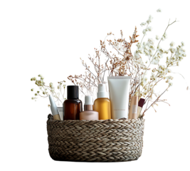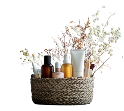 Cosmetics assortment beautifully presented in basket with blooming flowers isolated on transparent background for creative beauty and skincare projects