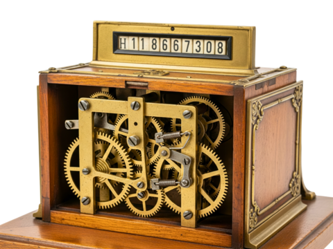 Antique clockwork mechanism with exposed brass gears in a wooden box on a transparent background