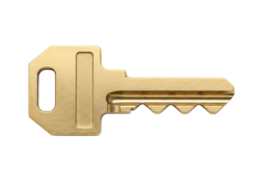 Brass door key isolated on transparent background, security and access hardware for home or office use