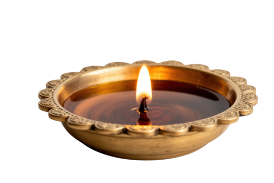 A lit oil lamp in an ornate brass bowl, casting a warm glow. background removed