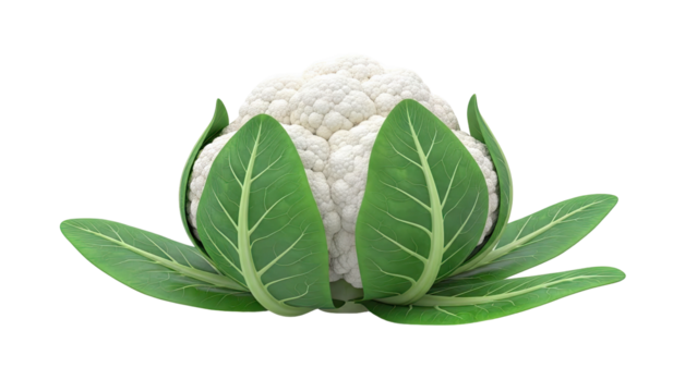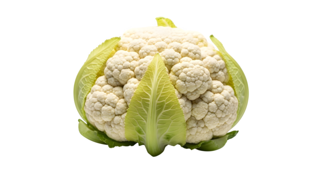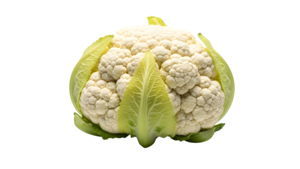 Fresh cauliflower isolated PNG on transparent background, healthy vegetable with green leaves for cooking and vegetarian diet