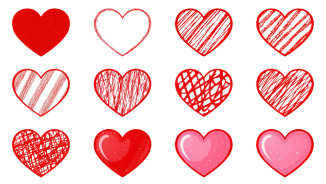 Set of twelve red hearts in different styles, including solid colors, outlines, and scribbled patterns, on a white background