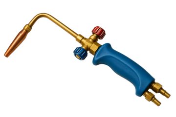 Industrial gas welding torch with blue handle and brass nozzle isolated on transparent background