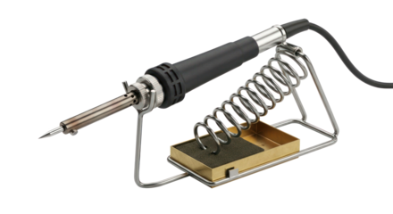 A black and silver soldering iron with a black and silver spring and a black and silver holder on a white background.