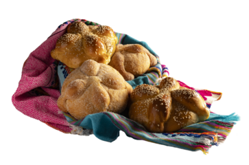 Bodegón. Varios pan de muerto o panes de muerto para la ofrenda tradicional mexicana, con ajonjolí y con azucar granulada sobre una servilleta multicolor. Aislado con fondo transparente o sin fondo.