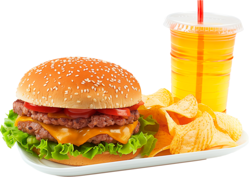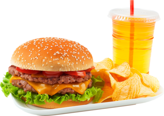 Hamburguesa doble con queso lechuga tomate y cebolla junto a una cerveza sobre fondo transparente