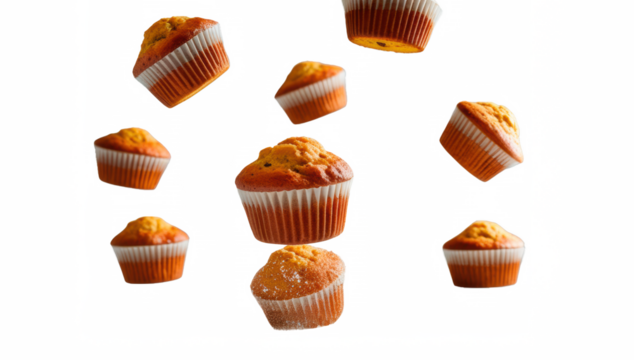 Muffins esparcidos por el aire sobre fondo transparente. PNG.