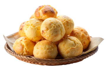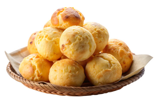 Golden brown Brazilian cheese bread rolls piled high in a woven basket isolated on a transparent background