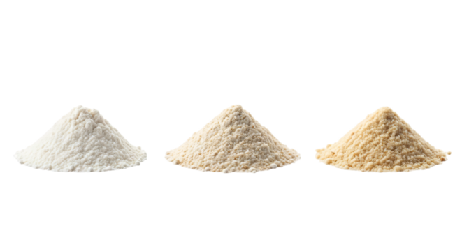 Three piles of flour white, beige, and brown isolated on transparent background