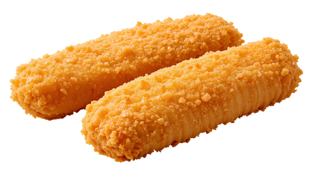 Close-Up of Two Crispy Breaded Fish Fingers – Golden-Brown Texture, Isolated Product Shot