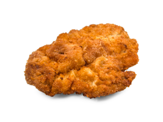 Fried chicken pieces float on white background coated in crispy crumbs with scattered sauce droplets