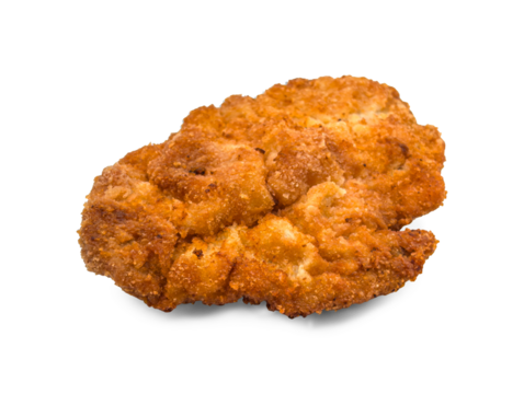 Crispy golden chicken nugget closeup shows detailed texture, breaded coating, and appetizing snack on a clean white background.