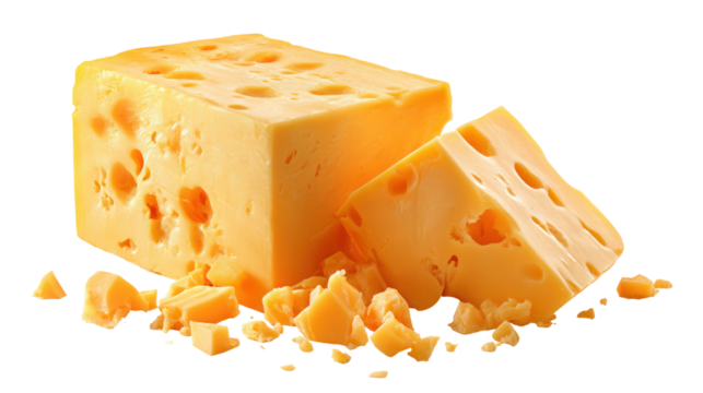 Block of Cheddar Cheese with Slices and Crumbs - Aged cheddar block with cut slices and natural crumbs on transparent background